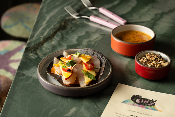 Serving: Housemade Bread & Butter, French Fries, Tomato Salad, & Fluke Ceviche with Sesame, Birds Eye Chili, Fresh Herbs & Flowers